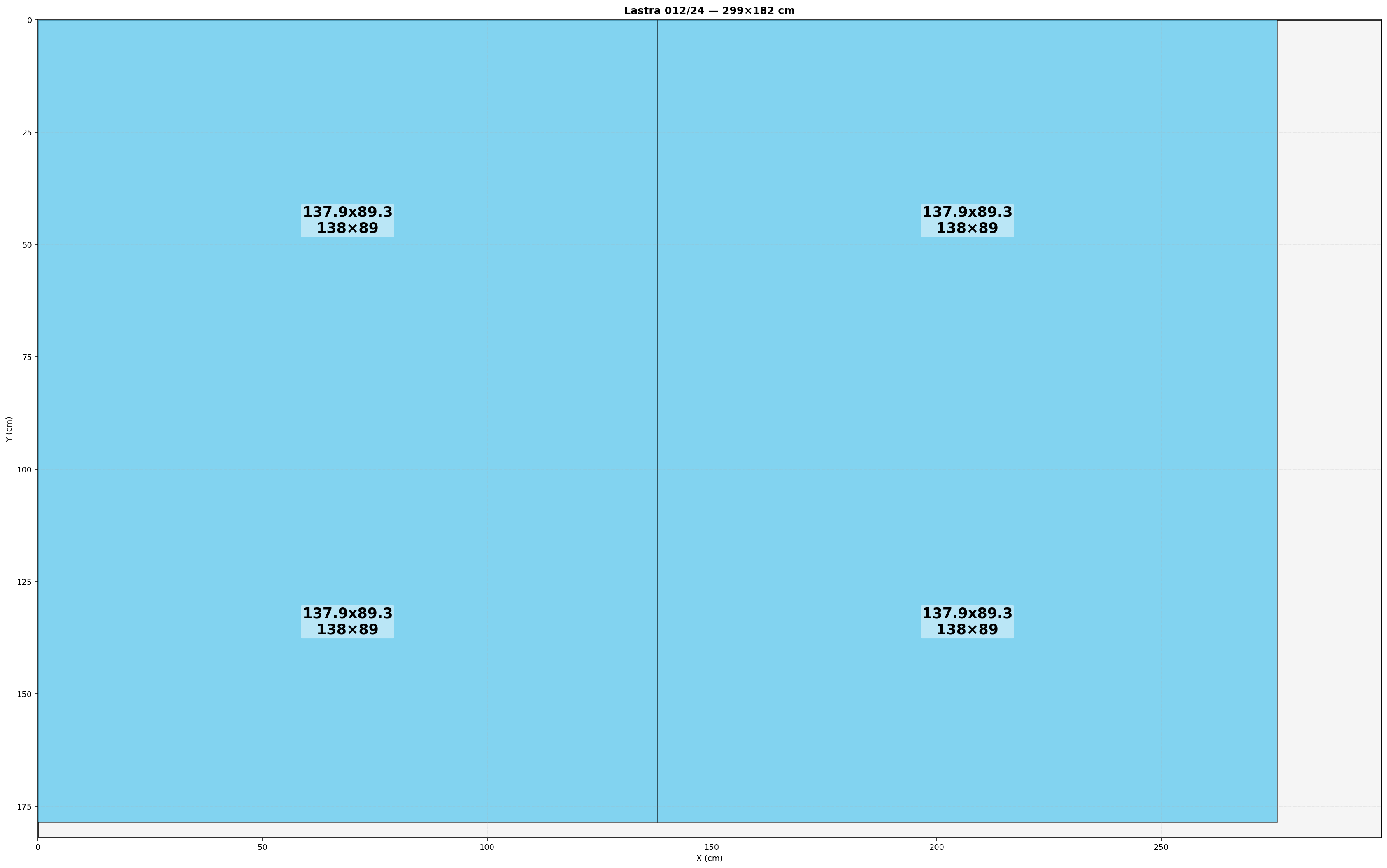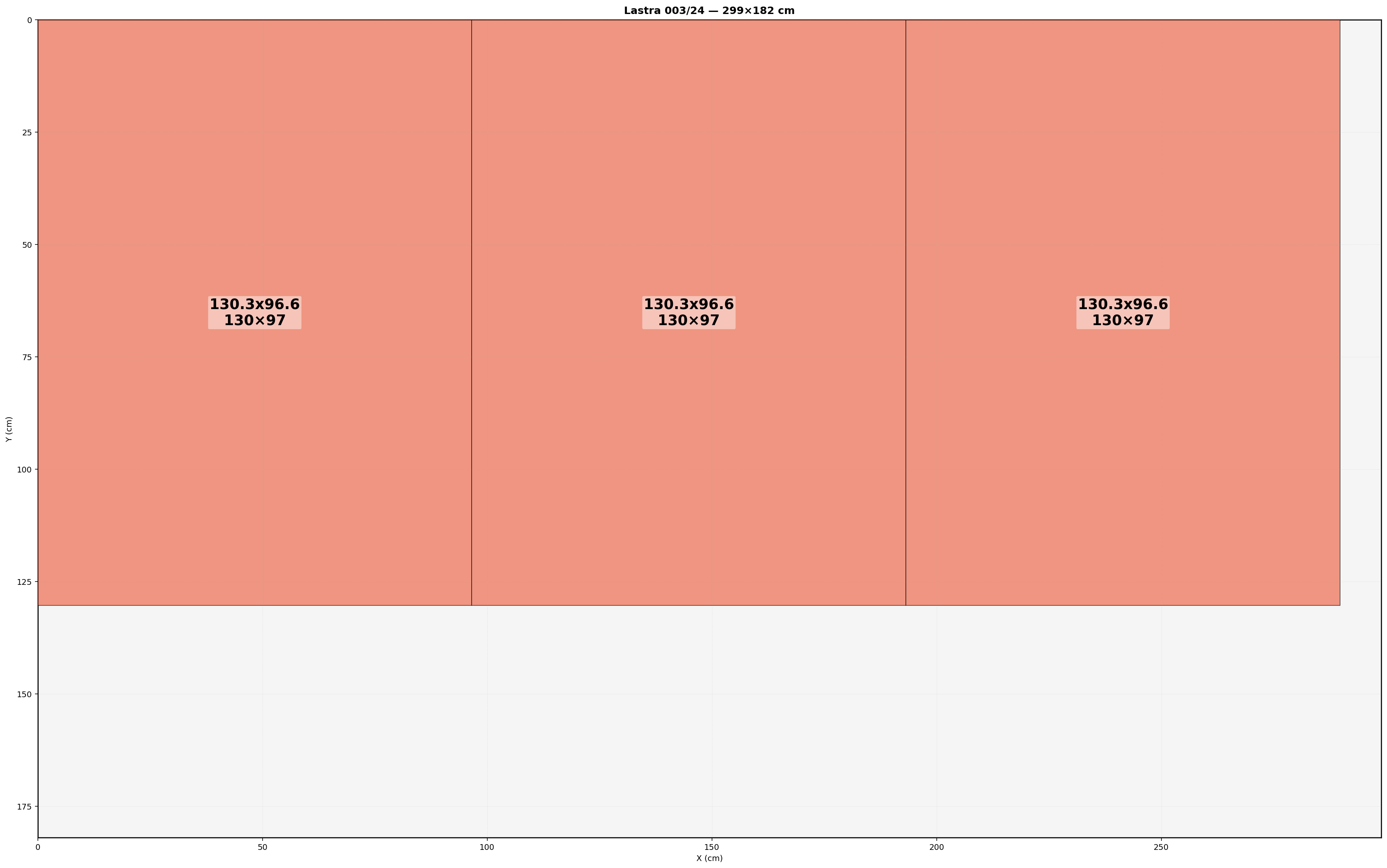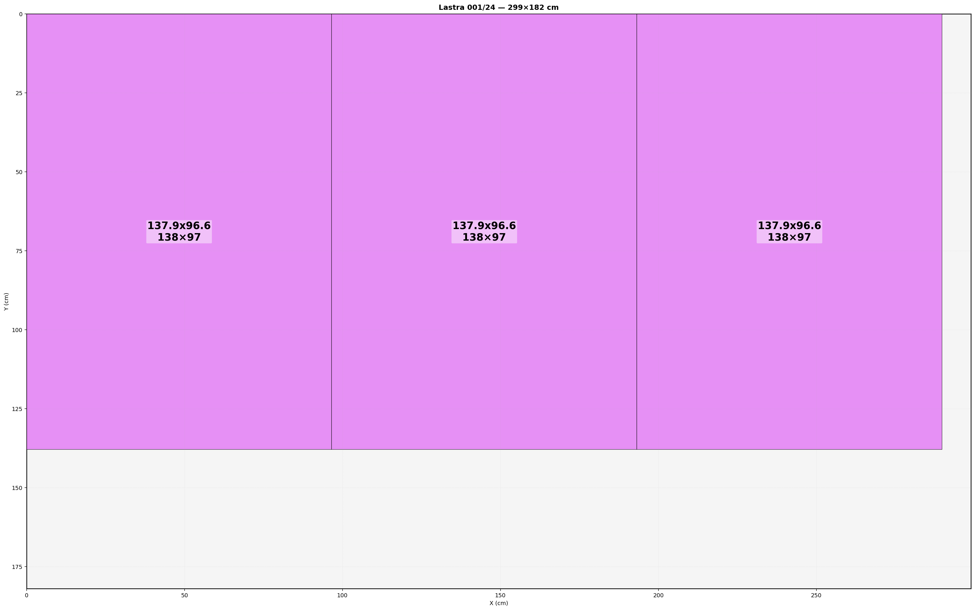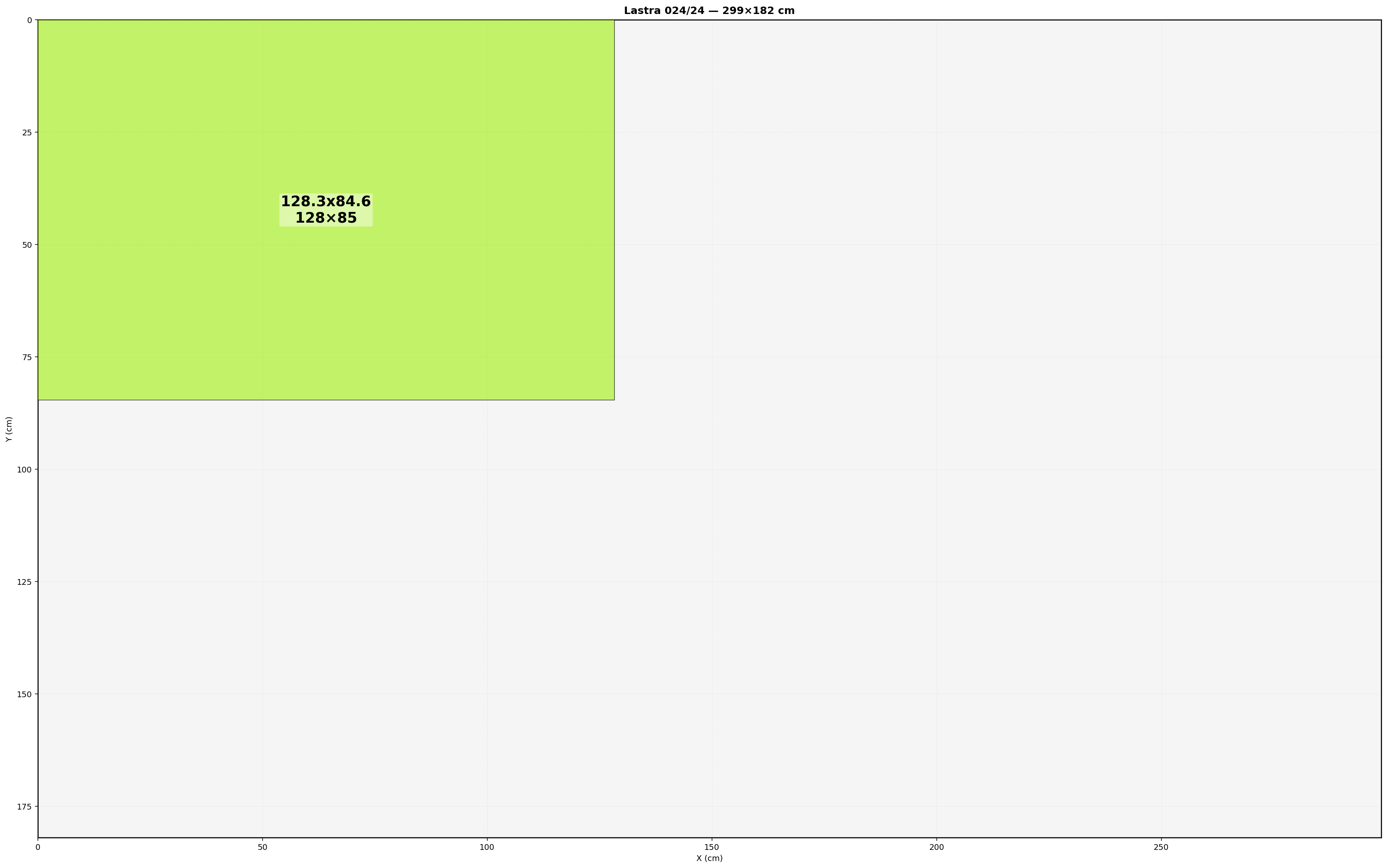 Lastra: 299.0x182.0 cm | Usabile=299.00x182.00 | Bordo=0.0 | Kerf=0.0 | Overrun=0.0