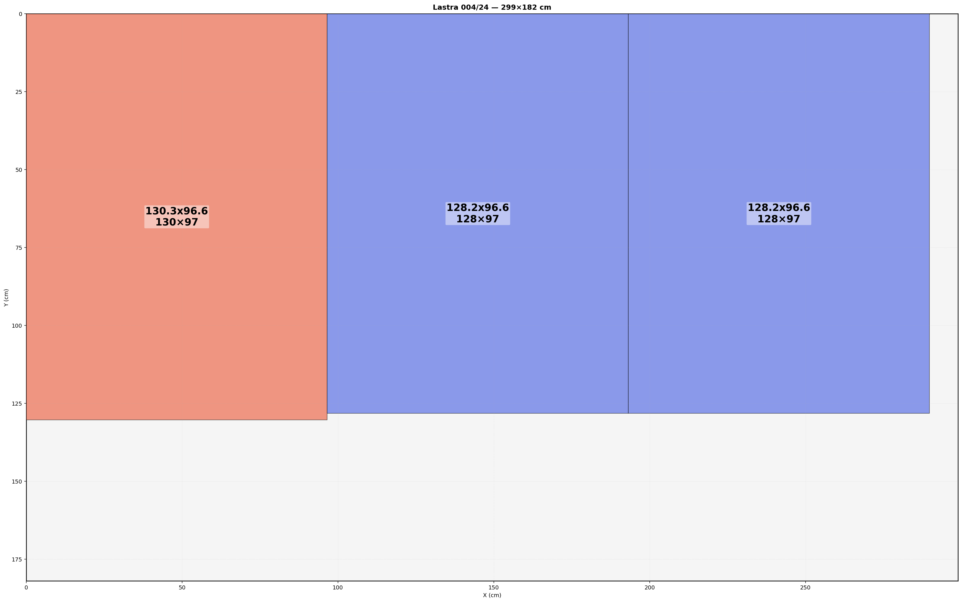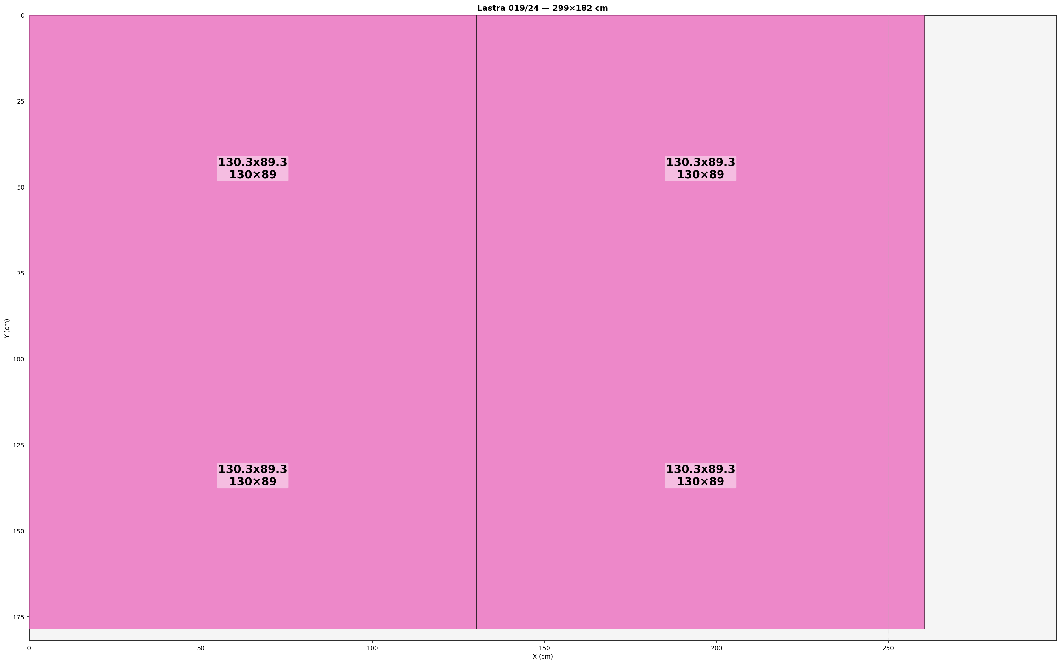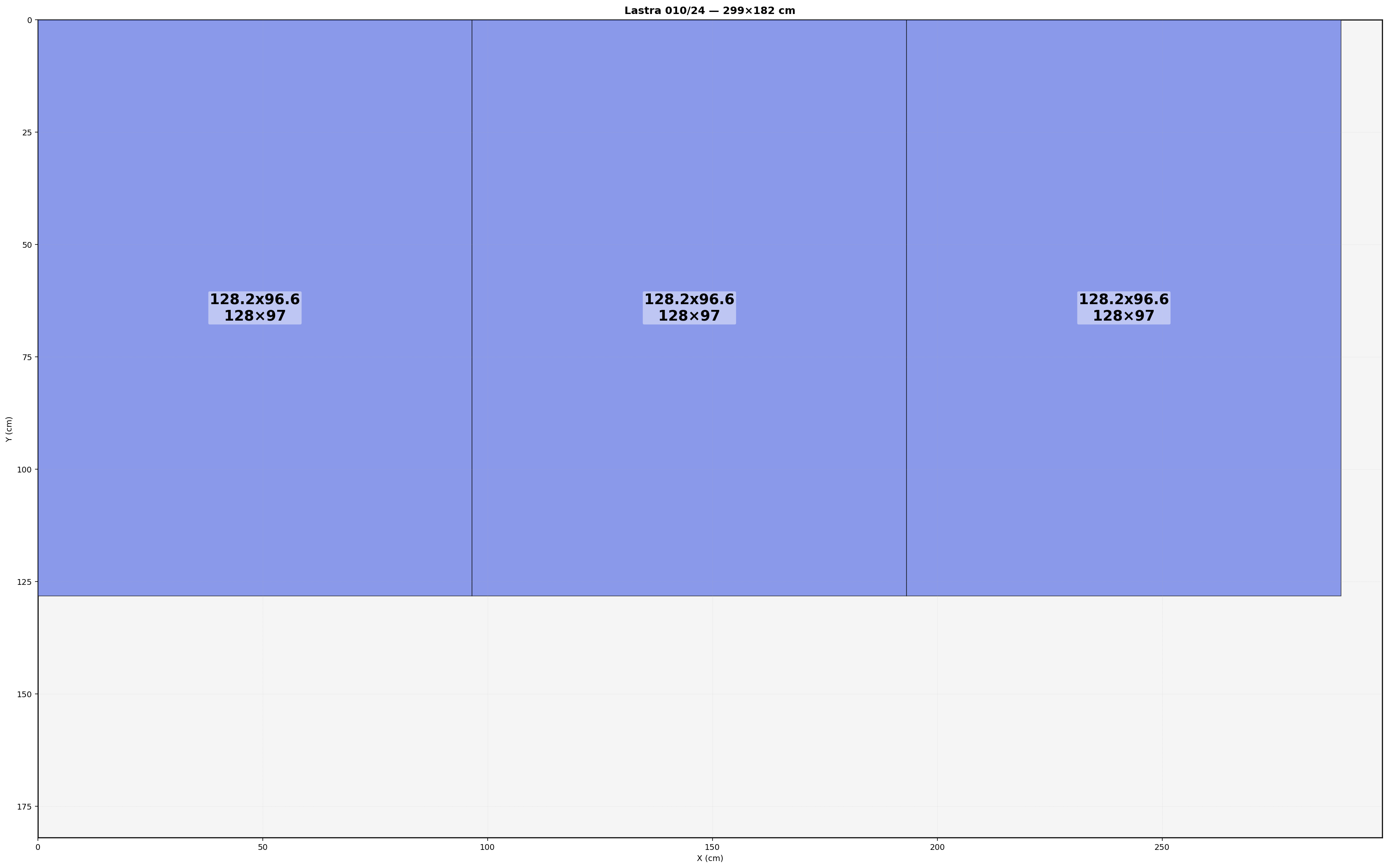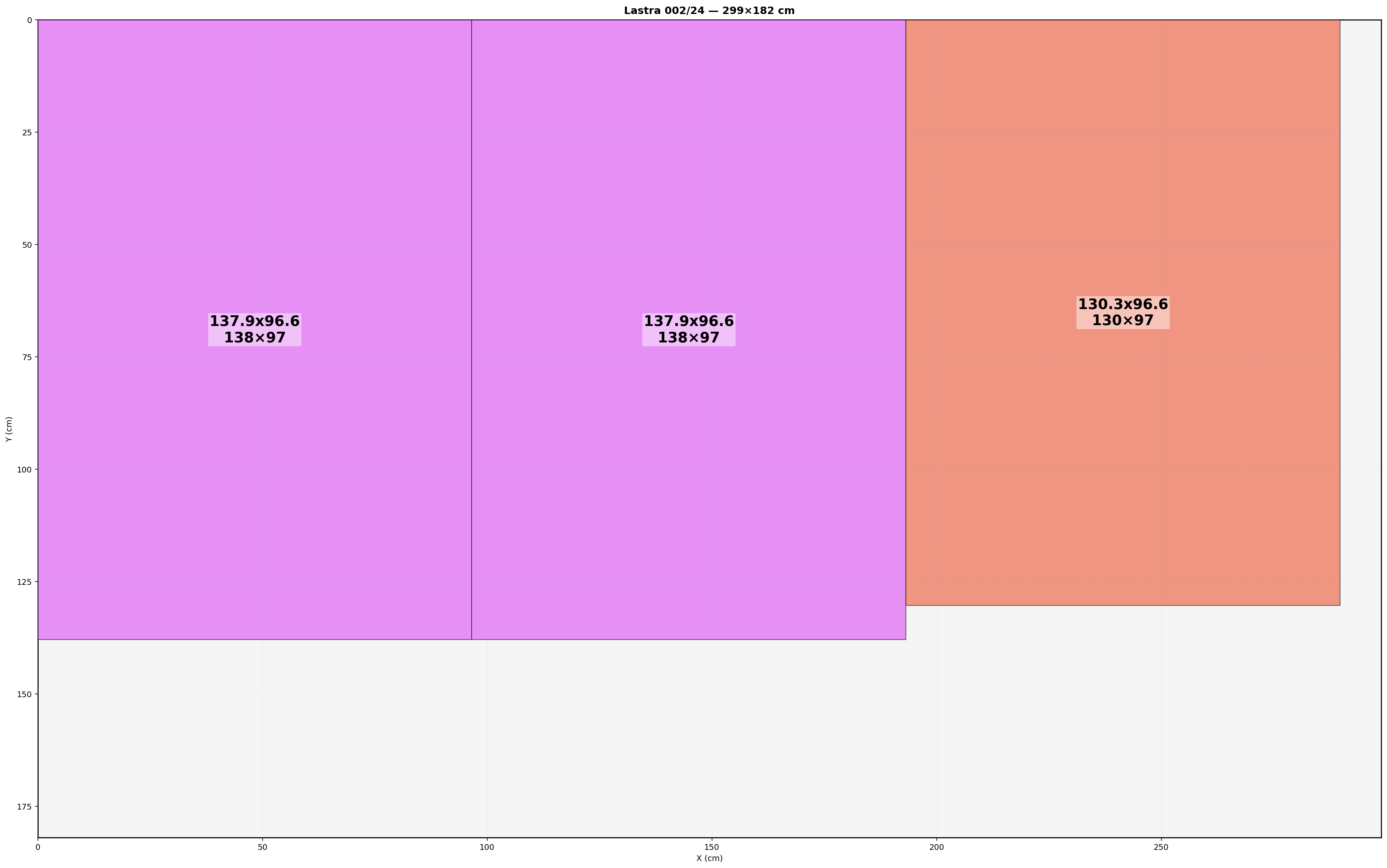 Lastra: 299.0x182.0 cm | Usabile=299.00x182.00 | Bordo=0.0 | Kerf=0.0 | Overrun=0.0