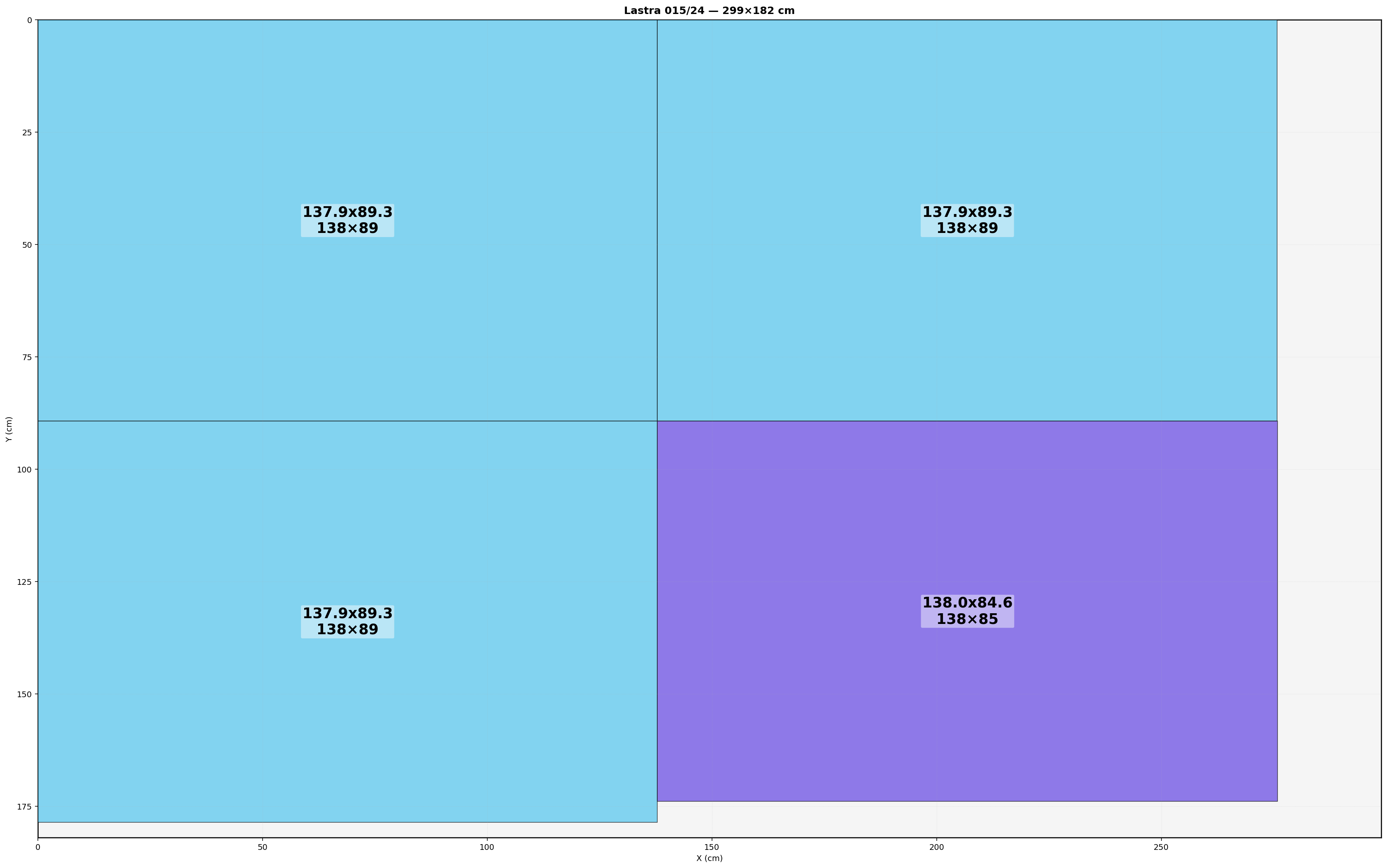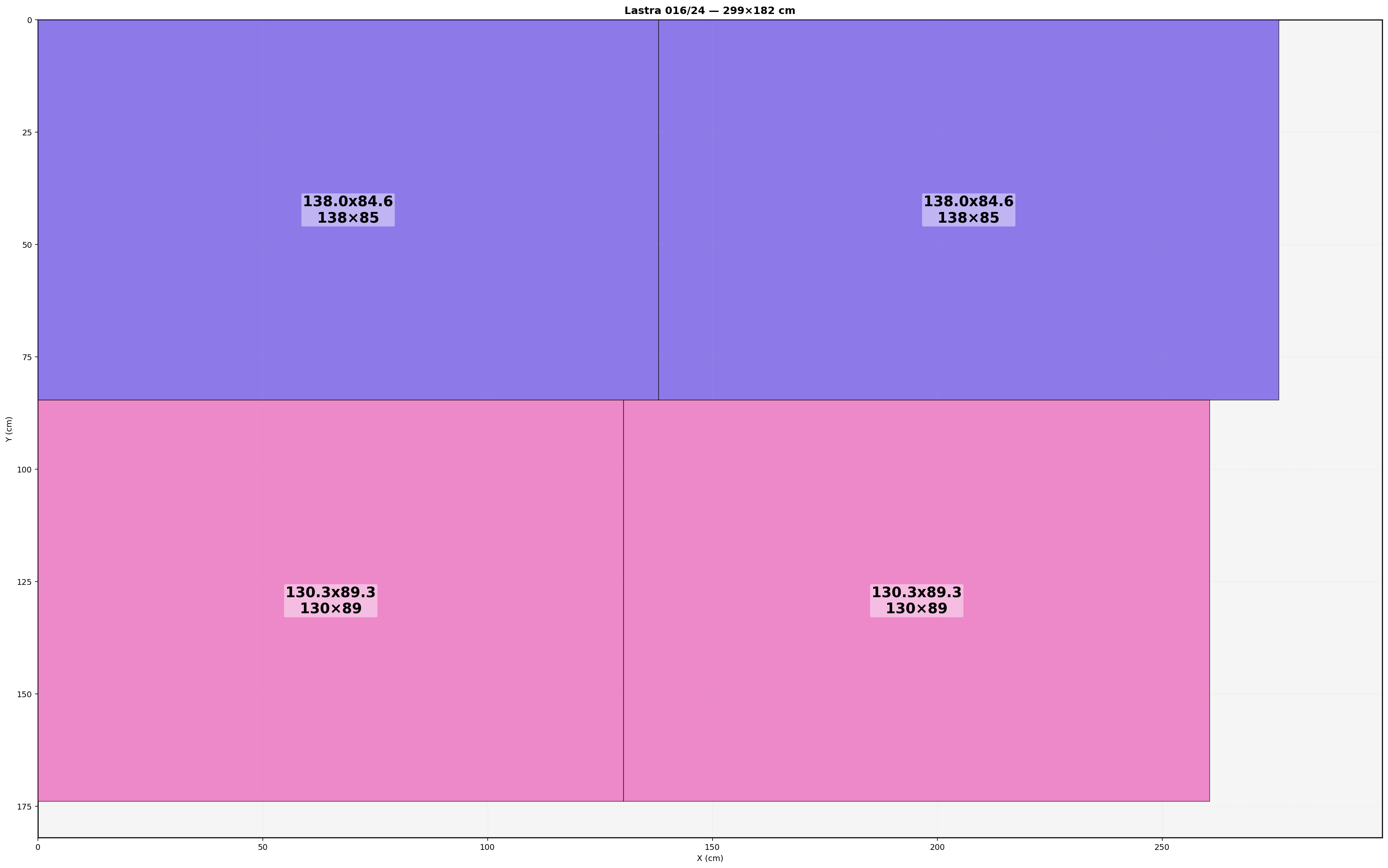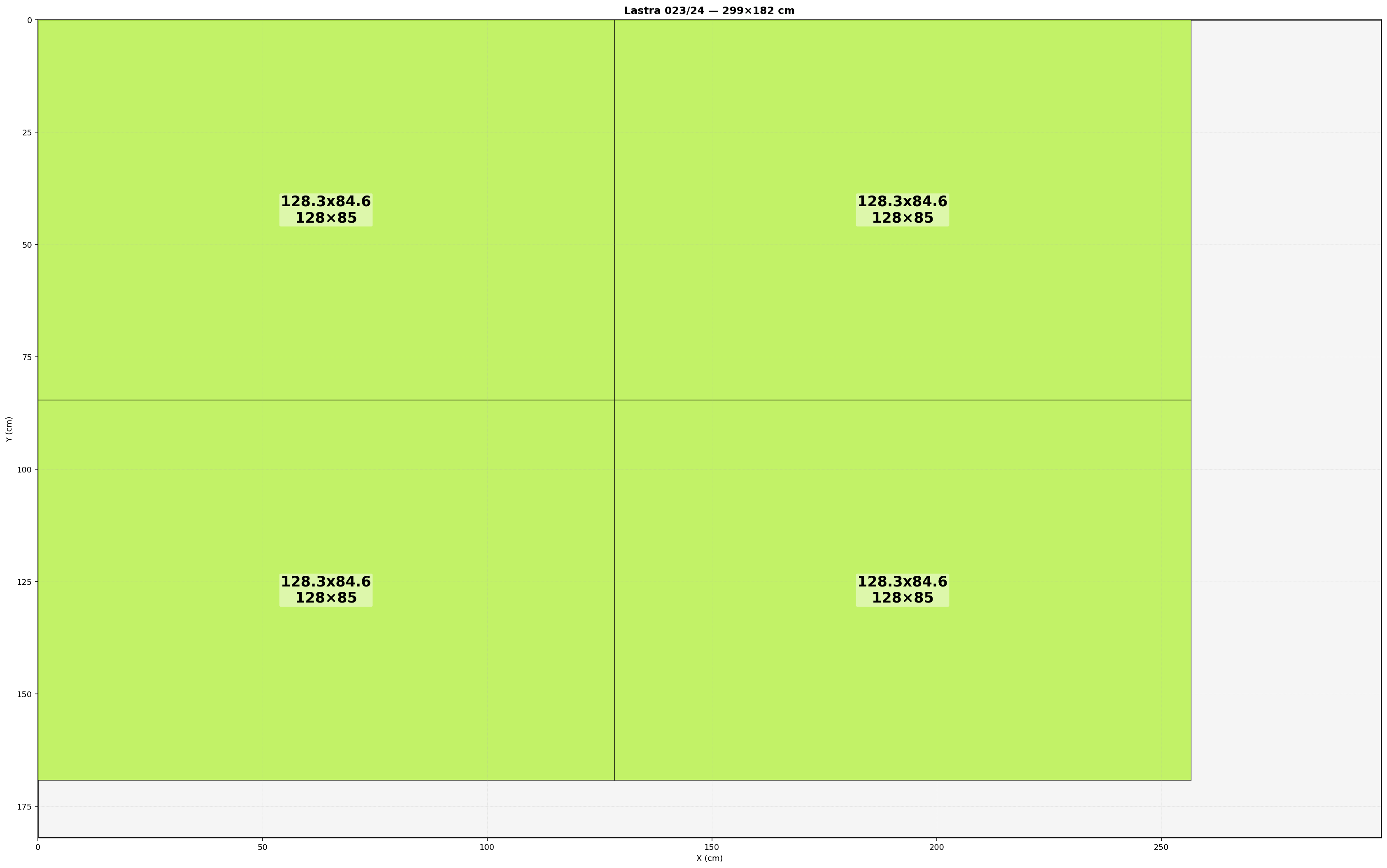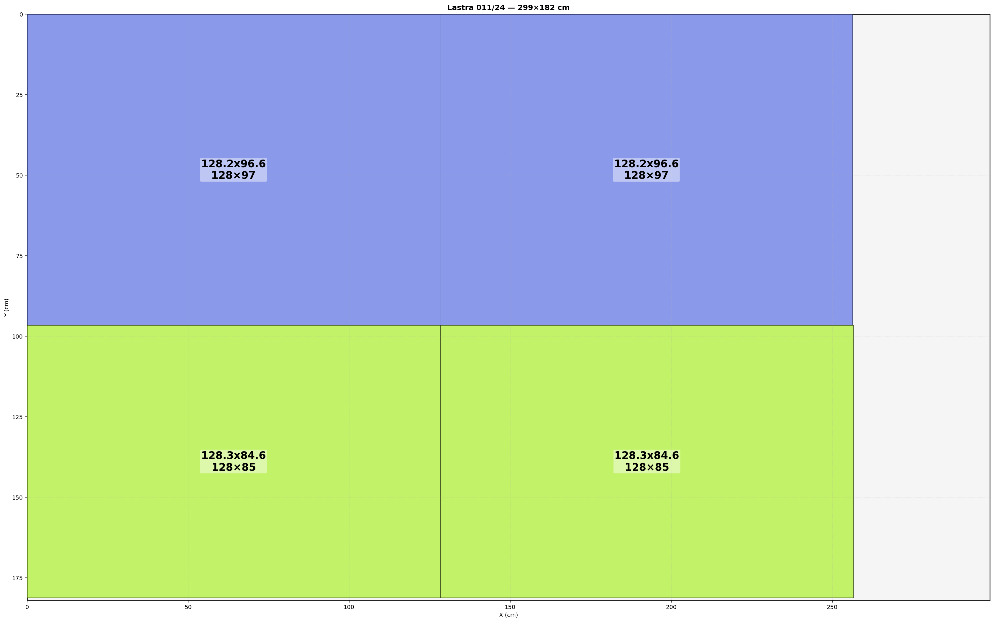 Lastra: 299.0x182.0 cm | Usabile=299.00x182.00 | Bordo=0.0 | Kerf=0.0 | Overrun=0.0